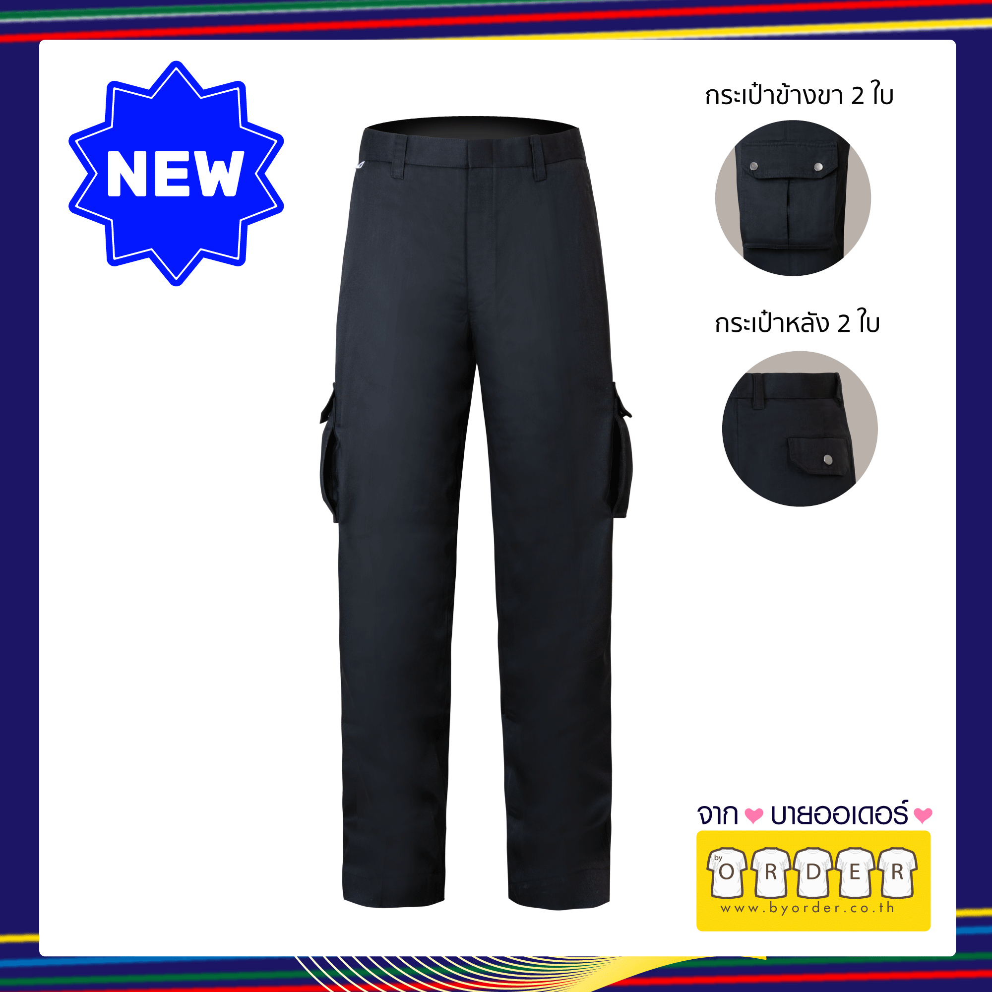 กางเกงคาร์โก้ V03 ติดเทป 2แถบ สีดำ